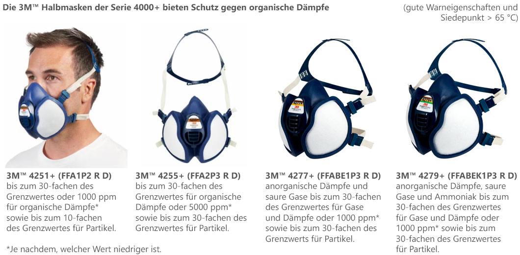 Die Halbmasken der Serie 4000+ sind sofort gebrauchsfertig und überaus zuverlässig. In verschiedenen Modellausführungen bieten sie Schutz vor Partikeln, Gasen und Dämpfen in industrieller Umgebung. 3M™ bietet vier Ausführungen für verschiedene Schutzstufen zur Auswahl. Die Masken eignen sich für zahlreiche Branchen und Anwendungen.